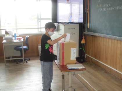 社会科の学習で選挙について考えました。18歳以上の国民に選挙権があることを押さえ,立候補している人の主張をよく考えて投票しました。
