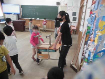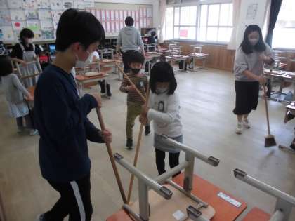 1年生の教室掃除が始まりました。ほうきの使い方や机の運び方などを優しく教えていました。
