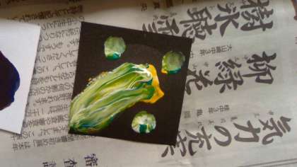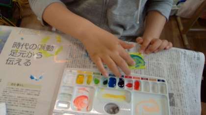 図画工作科の「色合い ひびきあい」では,絵の具を指で混ぜてみて,いろいろな色合いが生まれることを学習しました。