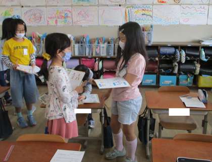 「I'm happy.」「I'm hungry.」など,たくさんの友だちと話す姿が見られました。