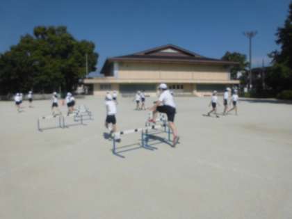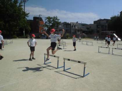 体育科の学習では,ハードル走をしています。自分に合ったインターバルを探しながら練習しています。最後の時間には,最初の時よりタイムが縮められるように頑張っています。