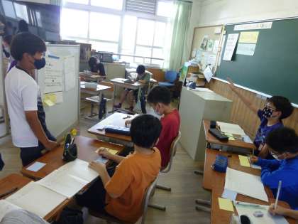 グループにわかれて,「エコ改修されたものが,本当に環境によいのか」を確かめるために,実験をすることにしました。今日は,子ども達が考えた実験の方法を他のグループの児童に説明して,アドバイスをもらいました。