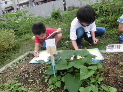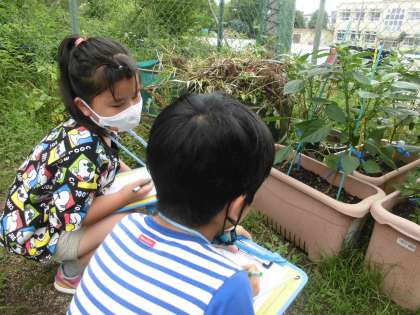 生活科で育てている野菜のお世話を毎日頑張っている2年生。毎日の観察の中で,新しい発見があると,みんなとても嬉しそうに報告をしてくれています。そんな,みんなの気持ちが伝わってか,ぐんぐん育ってきています。