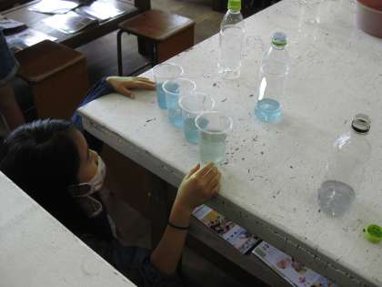 混ぜたり,コップに移し替えて並べたりして