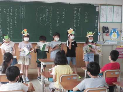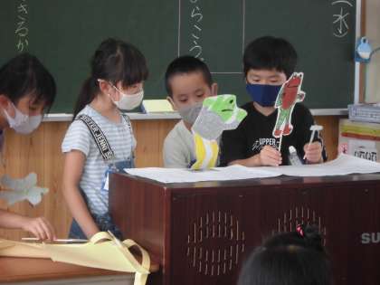 アーノルド=ローベル作の「お手紙」は,みんなが大好きなお話です。そこで,登場人物の気持ちになりきって,音読劇を行いました。どのように音読をしたら,がまくんやかえるくんの気持ちが伝わるかをグループで相談しながら学習を進めてきました。そして,役割を決めて,お面やペープサートも作り,音読劇を発表しました。また,ほかのグループの良かったところを見つけながら音読劇を鑑賞し,さらに音読の楽しさを感じることができたようです。