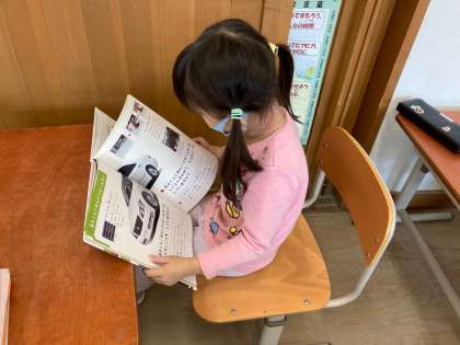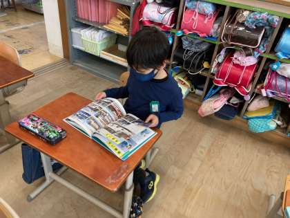 いろいろなはたらく車が載っている本に,みんな興味津々。