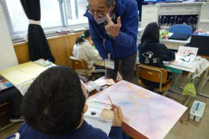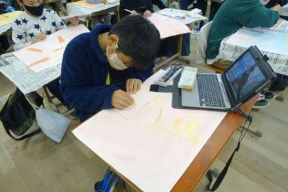 図画工作科の「わすれられない気持ち」では,体育参観のソーラン節の演技を,その時の一生懸命な気持ちが伝わるように工夫しながら絵をかいています。