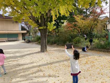 タブレットをもって,見つけた秋の写真をとりました。
