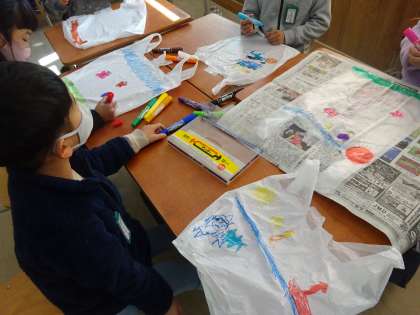 ビニール袋に絵を描いて,それぞれの凧を作ったあと,運動場で遊びました。