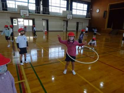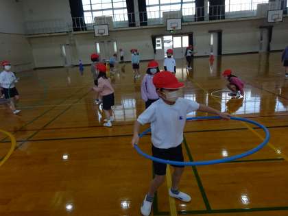フラフープを使って,投げたり腰でまわしたりして楽しみました。