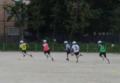 走る順番を工夫したり,走りながらバトンパスをする練習をしたりして,相手チームと競走することを楽しんでいます。ルールを守り,勝敗を素直に認め,仲良く運動しています。