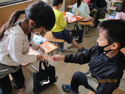 今日は,「9」がいくつといくつに分かれるのかについて,学習しました。授業の最後の方には,数図ブロックについているカードを使い,2人組で合わせて9になるようにカードを出し合うゲームもしました。みんな楽しみながら,積極的に学習することができています。