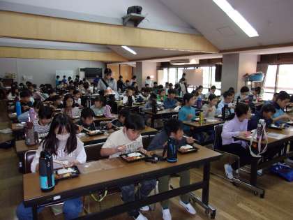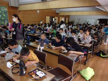 今日の昼食はお弁当です。子どもたちは,作ったばかりの自分のお箸でおいしく食べました。午後の活動は,フライングディスクとボルダリングです。