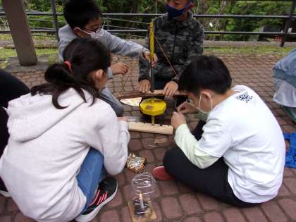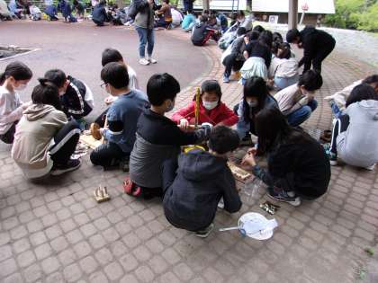 野外炊事の準備の火おこしです。グループで協力して火おこしに挑戦しています。どのグループも悪戦苦闘していますが,早く火がおこせたグループもあります。この火を使ってカレーライス作りをしていきます。