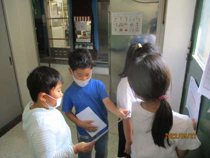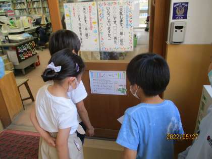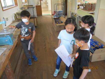 今日は,生活科の学習で2年生に学校探検に連れて行ってもらいました。少人数のグループになって,2年生から学校のことについてたくさん教えてもらっていました。理科室や放送室など,初めて入る教室に大興奮の1年生でした。