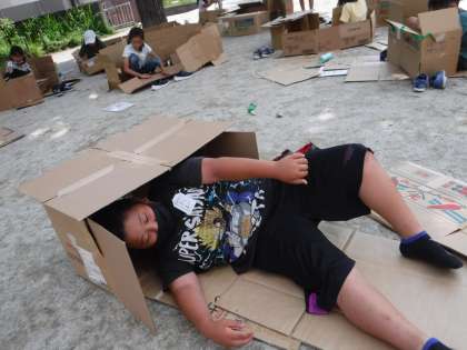 図画工作科で「ここにいたい」という,学習をしました。学校の中のお気に入りの場所に,段ボールを組み合わせて,心地よい自分だけの部屋を作りました。出来上がると,早速「自分のお気に入りの部屋」に友達を招待していました。