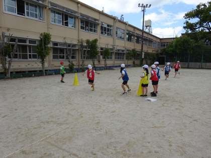授業の最初の頃は,自分の番になると一生懸命走っている子どもたちでしたが,回数を重ねるごとに,チームで協力して声を掛け合い,バトンをつなげる様子が見られました。