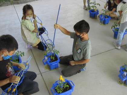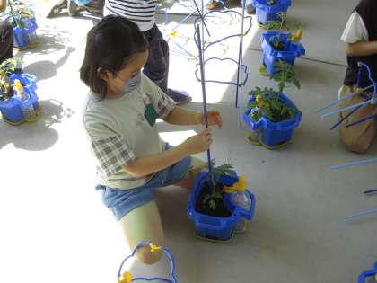 ミニトマトの支柱を立てました。