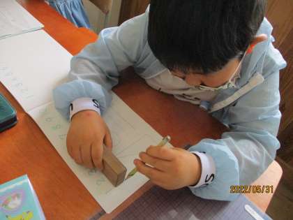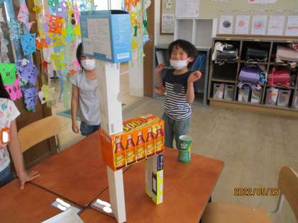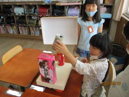 算数科では,「いろいろなかたち」の学習が終わりました。箱や筒を組み立てて動物や車を作ったり,積み木から側面の形を写し取ったり,楽しんでそれぞれの形の特徴を学ぶことができました。