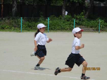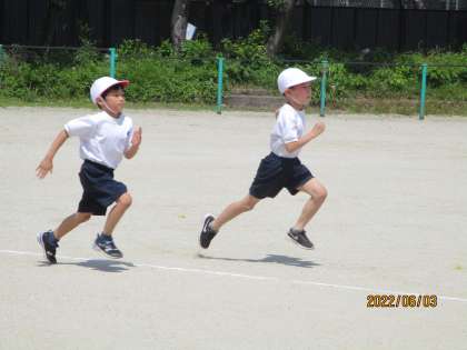 体育科の新体力テストで,50メートル走をしました。みんな力いっぱい,ゴールまで走り抜けることができました。走っている友達を,「○○さん,がんばれー!」と,応援する姿も素敵でした。