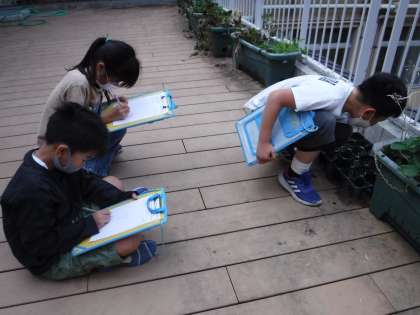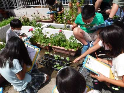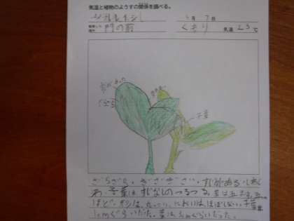 理科で育てているツルレイシが芽を出しました。そこで,子葉は,どんな形や色をしているのか,早速観察しました。