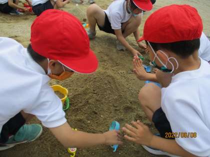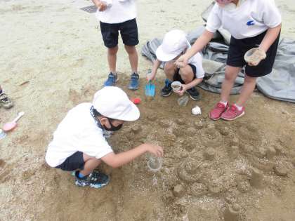 図画工作科の「すなやつちとなかよし」では,運動場の砂場に出てグループで協力しながら造形遊びを楽しみました。山やお城,アイス屋さんなどが砂場に広がりました。みんな力作を見せてくれました。