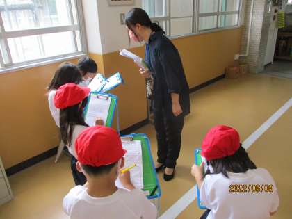 生活科のなかよしいっぱいだいさくせんでは,もっと詳しく知りたい部屋や教室について,インタビューに行きました。初めてお話する先生に,少しドキドキしている様子でしたが,丁寧な言葉づかいで上手にインタビューできていました。