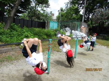 体育科「てつぼうあそび」では,意欲的に新しい技にチャレンジする姿が見られます。「先生,これできるようになったから見て!」と,嬉しそうに教えてくれます。友達と技のやり方を教え合う場面も見られ,お互いに高めあうことができています。