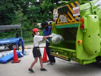 ごみ収集を始め、まちの美化につとめてくださっているまち美化事務所の方々に来ていただきました。1時間目は、パッカー車のつくりやごみ収集の際に気をつけていることを教えていただきました。そして、実際にパッカー車にごみを積み込む体験をしました。職員の方は、ごみを収集する中で、ごみに危険物が混じっていた場合にけがをすることもあるそうです。この体験を通して、普段の生活の中で、ごみの捨て方を改めて考えることができました。