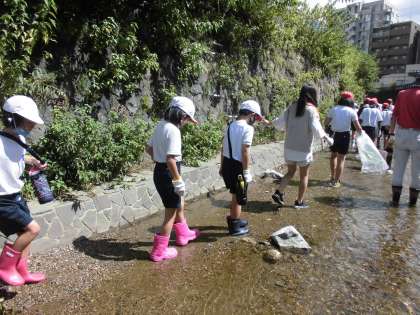 5年生とペアになって,川に落ちているごみをたくさん拾いました。