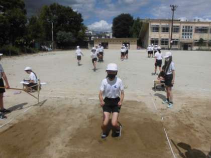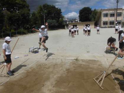 助走をとって、できるだけ遠くに跳べるように友達と相談しながら跳んでいます。