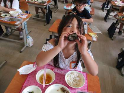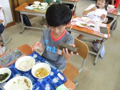 先日、給食の献立で、肉みそ納豆が出ました。納豆が苦手な子でも食べやすいよう、味噌が入っていて甘辛く、おかわりにも列ができていました。お寿司屋さんのようにのりに巻き、みんなでおいしくいただきました。