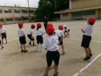 数人で手をつなぎ、端から端までフラフープをくぐりながら回していく遊びをしました。手を使わないで、体をよじらせながら頑張っていました。