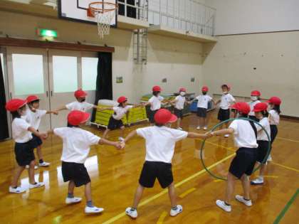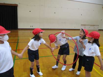 数人で手をつなぎ、端から端までフラフープをくぐりながら回していく遊びをしました。手を使わないで、体をよじらせながら頑張っていました。
