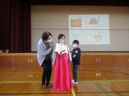 初めて知るお隣の国のことに、子どもたちも興味津々。韓国の伝統衣装にも触れさせていただきました。授業が終わるころには、韓国語で自己紹介や、じゃんけんができるようになりました。今日の学習を機に、韓国や、世界の国々に興味関心を広げていってほしいと思います。