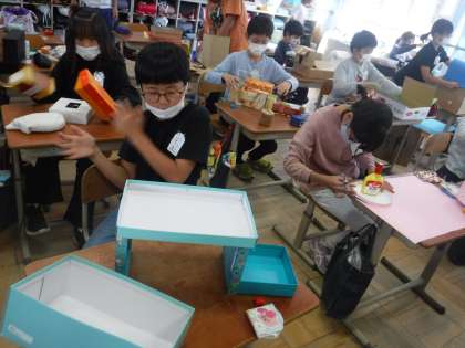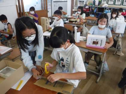 図画工作科では、いろいろな箱を組み合わせて、自分だけのオリジナル小物入れを作っています。今日は、まず、段ボールや箱をダンボールカッターやはさみを使って切込みを入れました。切りにくい所は、友達に支えてもらいながら、切っていました。箱を組み立てていきながら、どんどんアイディアが膨らんでいくようでした。