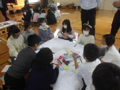 ワークショップでは、友達と話し合い様々な意見を出していました。活動の後に班長がどのような意見が出たのかを発表し、全体交流を行いました。