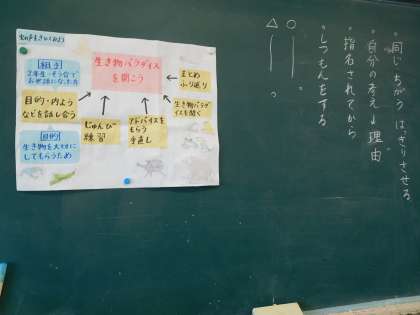 総合的な学習の時間では,生き物を大切にしてもらうためにどんなことができるかをグループで考えています。