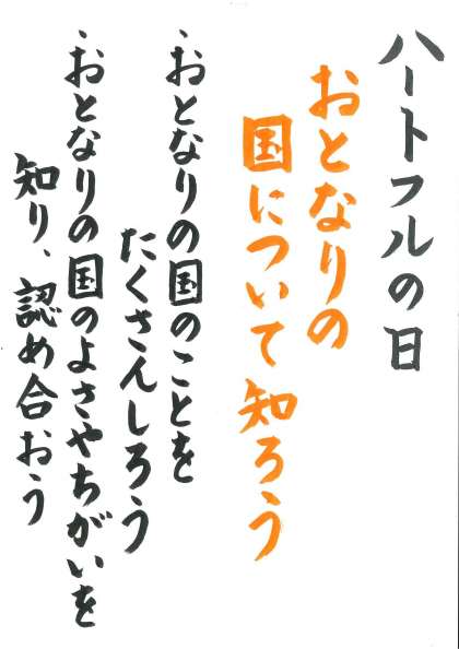 今月のハートフル学習のテーマは、「おとなりの国について知ろう」です。おとなりの国に限らず、お友だち、いろいろな国の方と仲良くなるには、まず、よく知ることから始まります。その人、その国のことを知ることでよさが分かり、認めていくことができると思います。子どもたちがグローバルな社会で活躍するためにも、いろいろな国の方と仲良くなっていってほしいです。