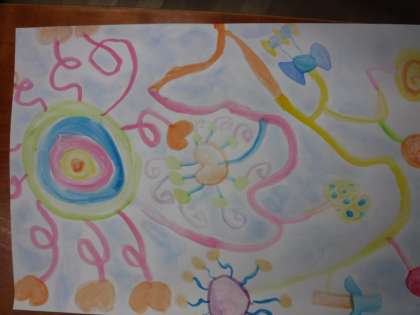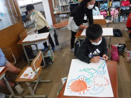 図画工作で「まぼろしの花」の絵画を制作しています。それぞれに想像した「世界に一つの花」を絵の具を使って描きました。構図も色合いもみんなユニークで、すてきな花が咲きました。