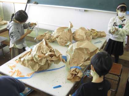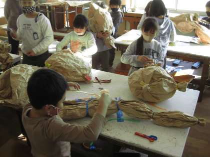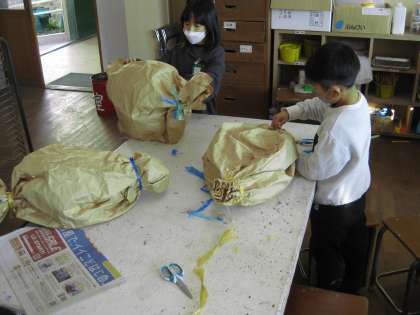 大きなクラフト紙をくしゃくしゃにして袋を作り、