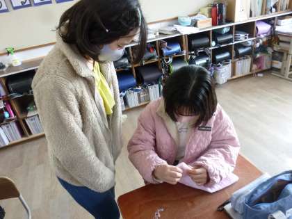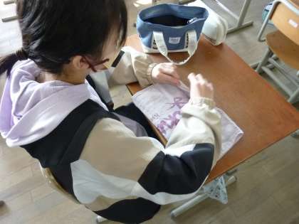 家庭科の時間に、これまでお世話になった学校へのお礼として、ぞうきんを手縫いしました。気持ちを込めて縫いました。