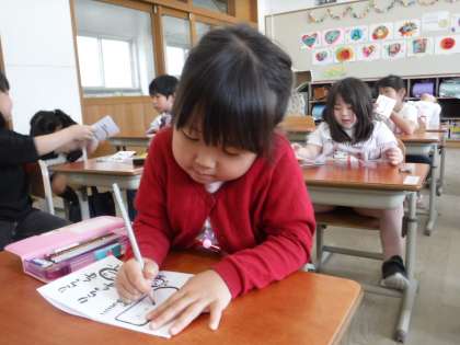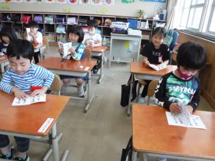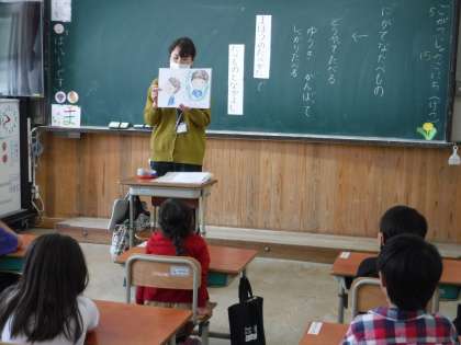 栄養教諭の平野先生に、苦手な食べ物も食べられるようになる「たべかたのまほう」を教えていただきました。その後の給食では、苦手な食べ物が出てきた子が、食べ物の魔法をかけると、おいしく食べられることができました。