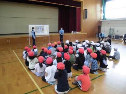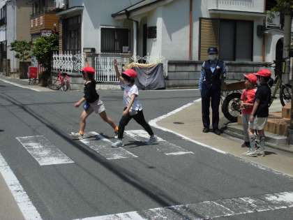 交通安全教室を行いました。警察の方に道路の歩き方や横断歩道の渡り方を教えていただき、実際に歩いて実践しました。PTAや地域の方など、たくさんの方にご協力いただき、安全に歩くことができました。これからの登下校の時に意識してほしいです。