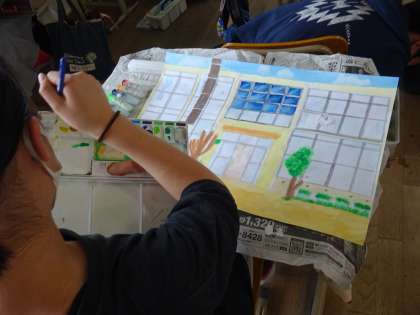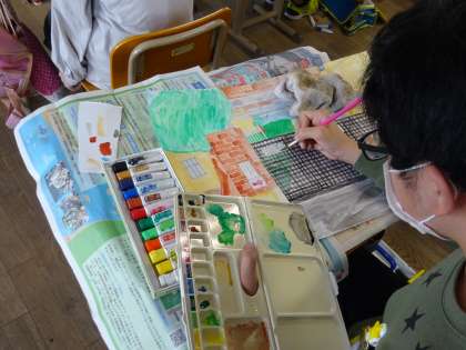 絵の具の水の量や筆の向きに気を付けながら色をつけていっています。完成が近づいてきて、出来上がりが楽しみです。