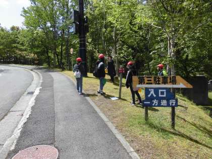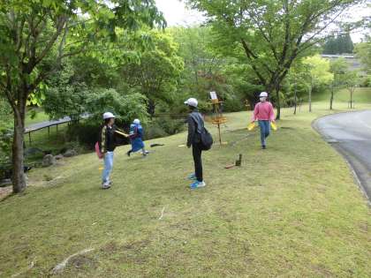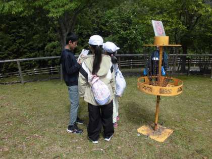 今日の最初の活動,フライングディスクゴルフを楽しみました。フリスビーを飛ばしながらコースを回っていきます。思い通りに飛ばないフリスビーに悪戦苦闘しながらも喜んで活動していました。