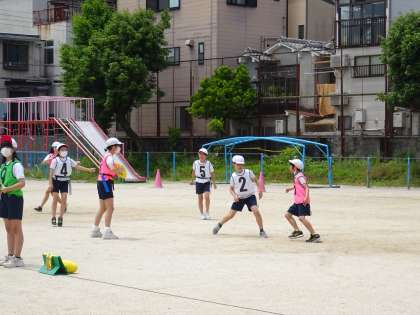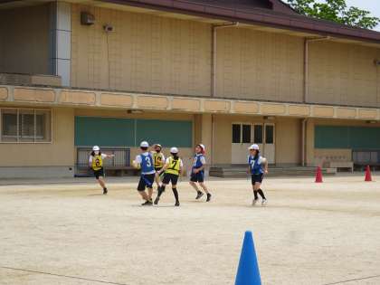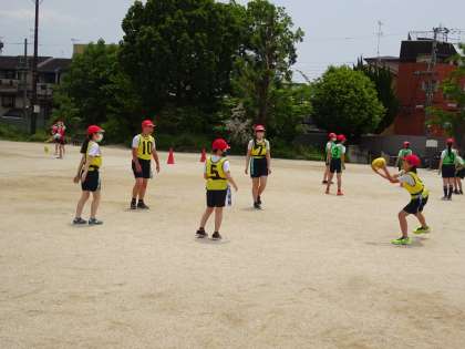 タグラグビーの学習が始まりました。ラグビーボールに慣れるために、パスの練習からスタートしました。ルールを確認しながら、少しずつ試合に慣れていってほしいと思います。