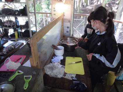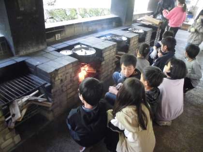 火を起こす係、野菜を切る係、お米を研ぐ係などそれぞれが自分の責任を果たして作っています。