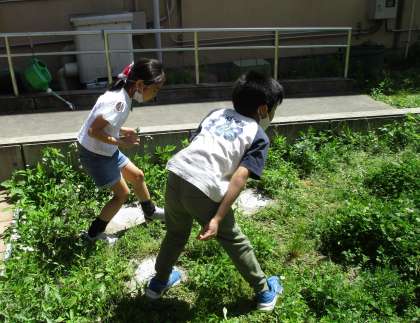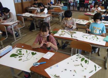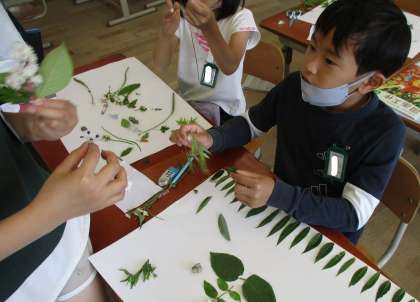 図画工作の時間に、身近にある、植物や石などを使って、画用紙に模様を描いていきました。