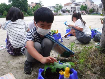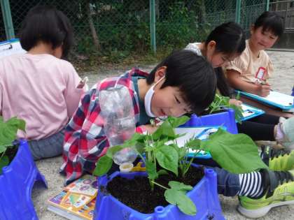 アサガオが、ぐんぐん大きくなってきました。そこで、もっと大きくなってもらうために、間引きをしました。根を傷付けないように、そっと間引きをすることができました。